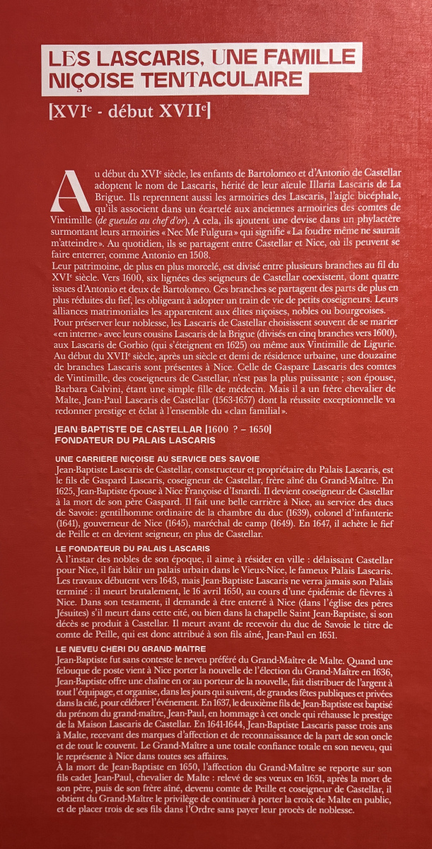 L’exposition mettra en lumière la famille Lascaris et plus particulièrement la branche Lascaris-Vintimille. Un focus important sera réalisé sur la figure de Jean-Paul de Lascaris (1560-1657) qui fut Grand Maître de l’Ordre de Malte (1636-1657), alors à son apogée. Au travers de l’histoire des Lascaris sera évoqué plus largement la question des nobles dans le Comté de Nice et leur relation avec L’Ordre de Malte, aux XVIIe et XVIIIe siècles.